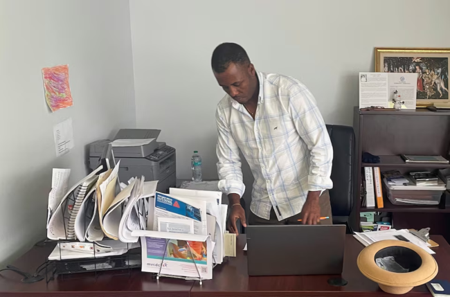 Bansal Oreus helps other Haitian immigrants with government documents at the St. Vincent de Paul Society in Springfield, Ohio, U.S., August 15, 2024. REUTERS/Howard Schneider/File Photo