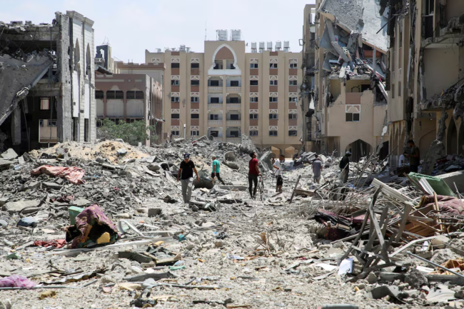 Palestinians inspect damage in Qatari-funded Hamad City, following an Israeli raid, amid the ongoing conflict between Israel and Hamas, in Khan Younis, in the southern Gaza Strip, August 24, 2024. REUTERS/Hatem Khaled/File Photo