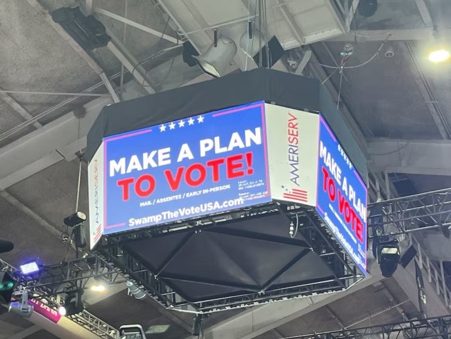 A view shows a jumbotron urging Trump supporters to make a plan to vote early or in-person on Election Day, during a campaign rally in Johnstown, Pennsylvania, U.S., August 30, 2024. REUTERS/Nathan Layne