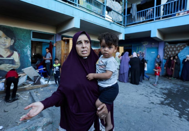 A Palestinian woman carrying a child reacts, after an Israeli air strike on a UN school sheltering displaced people, amid the Israel-Hamas conflict, in Nusairat in central Gaza Strip, July 6, 2024. REUTERS/Ramadan Abed