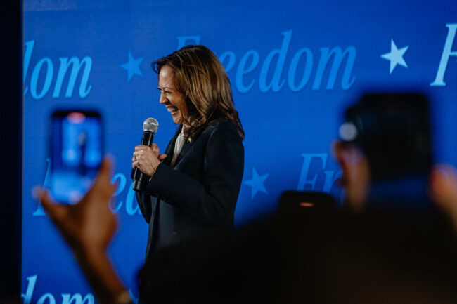 President Kamala Harris makes a surprise appearance at a Harris-Walz Debate Watch Party at Cherry Street Pier after her debate with Republican Presidential nominee Donald Trump in Philadelphia, on Sept. 10, 2024. | Jamie Kelter Davis for POLITICO