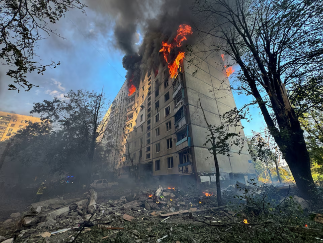A view shows a burning apartment building hit by a Russian air strike, amid Russia’s attack on Ukraine, in Kharkiv, Ukraine August 30, 2024. REUTERS/Vitalii Hnidyi